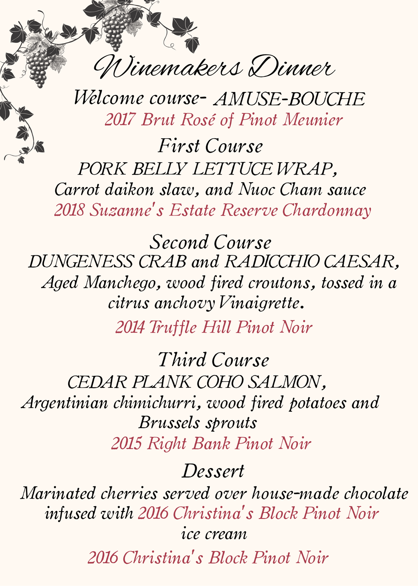 This special experience features a five-course food and wine pairing, where each dish is carefully designed to complement the character and elegance of our wines. From the first sip to the final course, guests will enjoy a seamless blend of flavor, romance, and warmth.