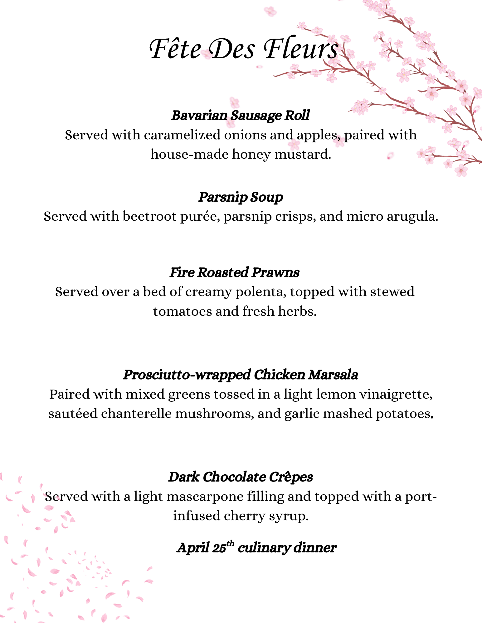 Join us as the vineyard comes back to life and the estate awakens from winter's rest. This special culinary dinner celebrates the return of spring with a multi-course menu showcasing the season's first tender greens, fresh herbs, and vibrant flavors paired with our estate-grown wines.