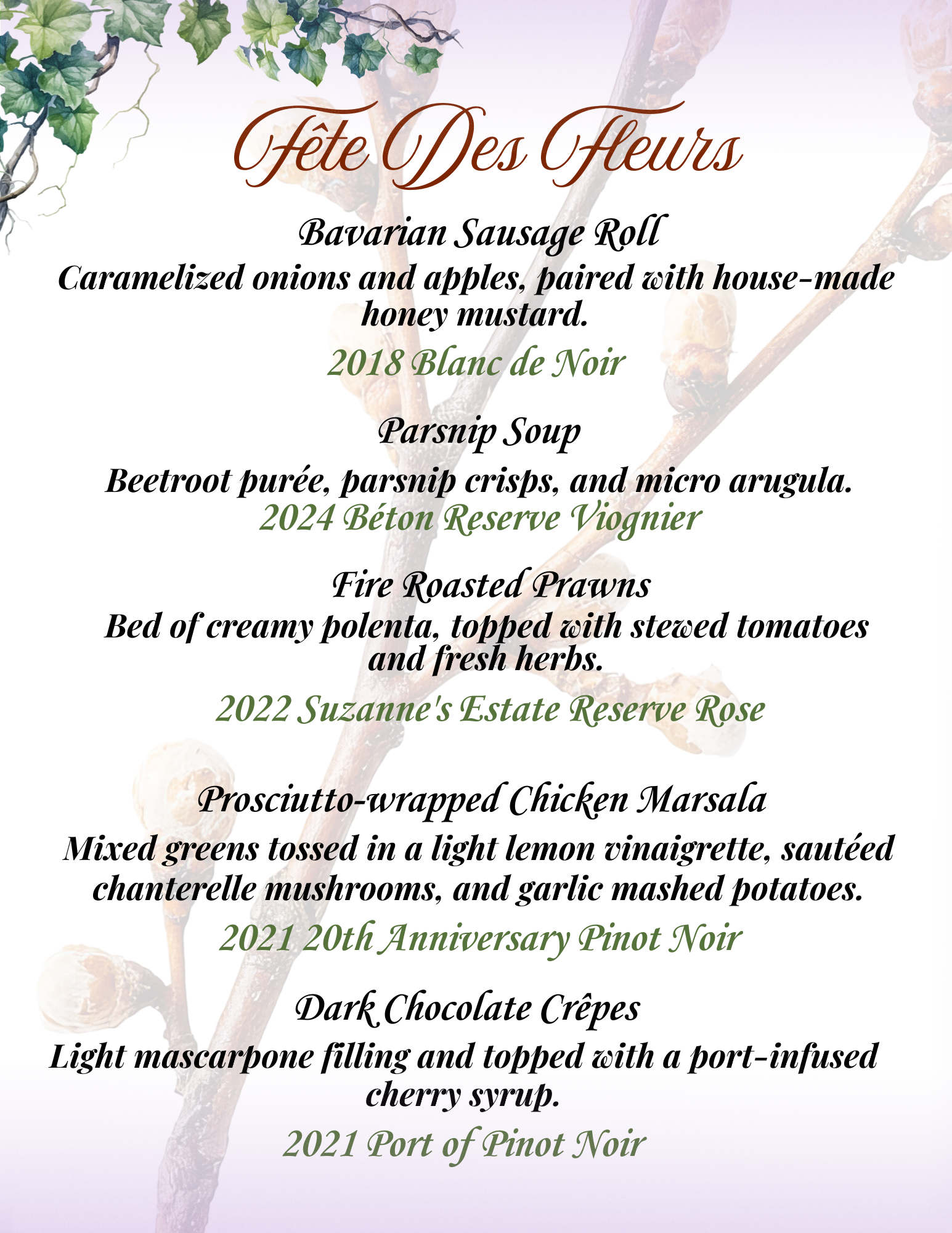 Join us as the vineyard comes back to life and the estate awakens from winter's rest. This special culinary dinner celebrates the return of spring with a multi-course menu showcasing the season's first tender greens, fresh herbs, and vibrant flavors paired with our estate-grown wines.